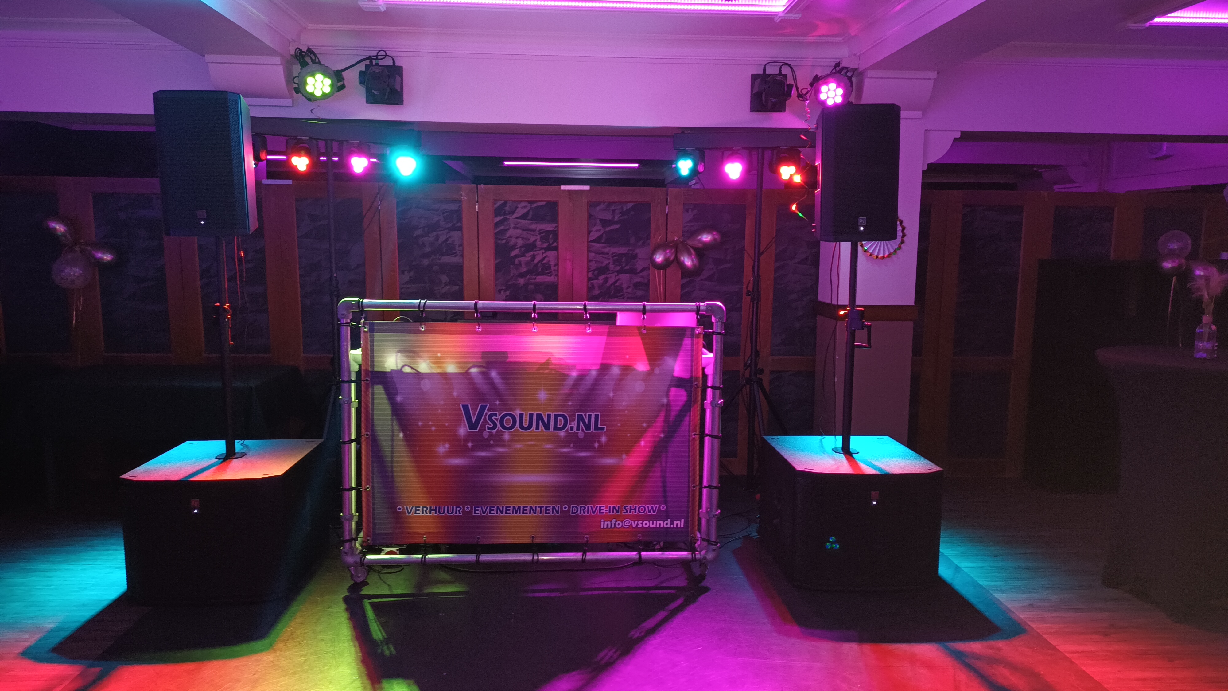 Geluidset Electro Voice tot ±250 personen 4x movinghead LED (beweegbaar licht) 4x RGB LED par verlichting 1x hazer (rookmachine) 1x spiegelbol zwarte sterren doek 4 meter hangend aan de truss 5 uur DJ MarcelV Prijs € info@vsound.nl